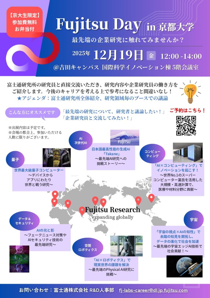 キャリア支援2025.10.30 【12/19開催】Fujitsu Day in 京都大学 最先端のAI・量子コンピューティング・ロボティクス・宇宙技術など、富士通が挑む未来志向の研究に触れられる特別イベントを開催します。企業研究員との交流を通じて、研究の最前線とキャリアの可能性を探ってみませんか?(京都大学生限定/参加無料・お弁当付) 詳細は以下のリーフレットをご確認ください。 前の記事へ 次の記事へ
